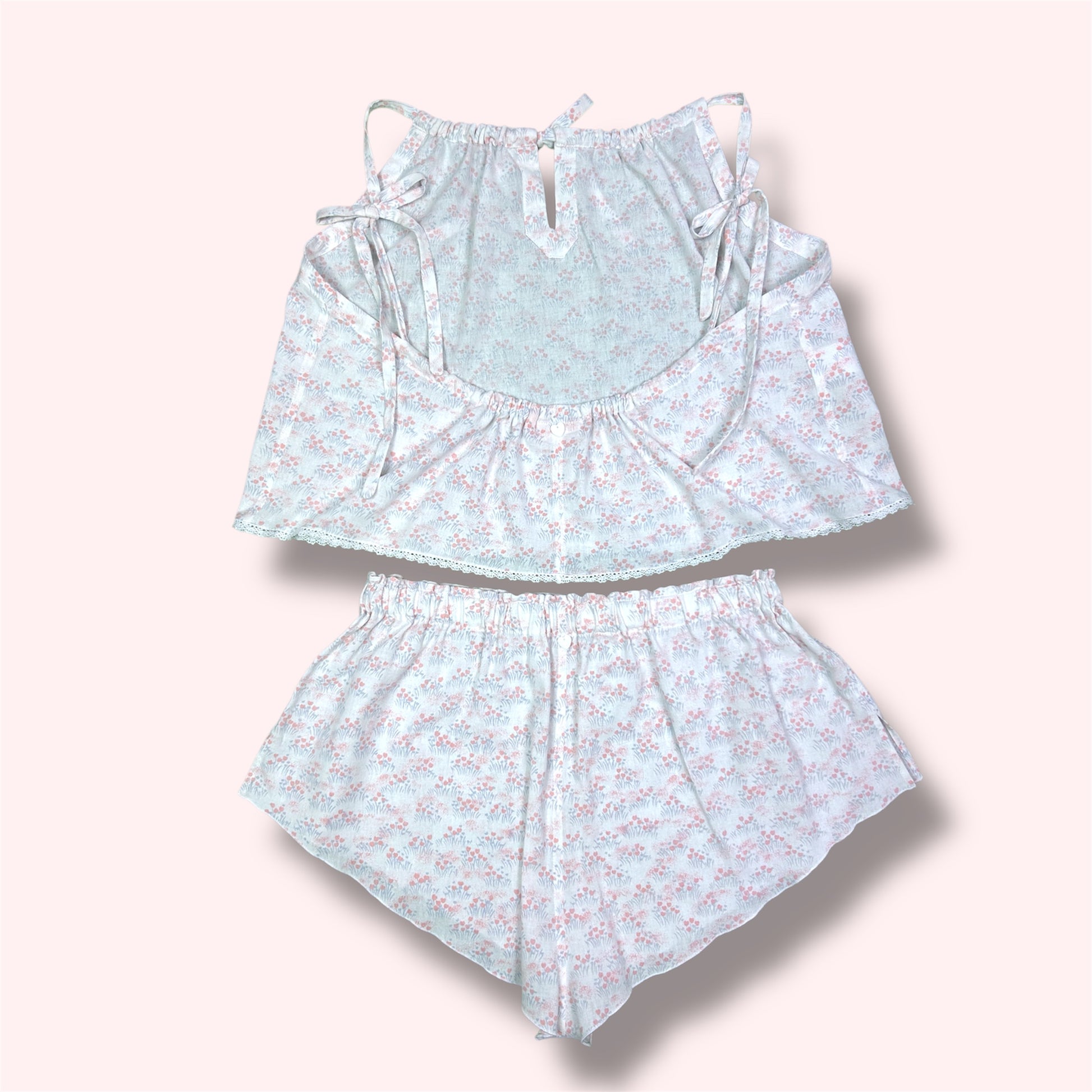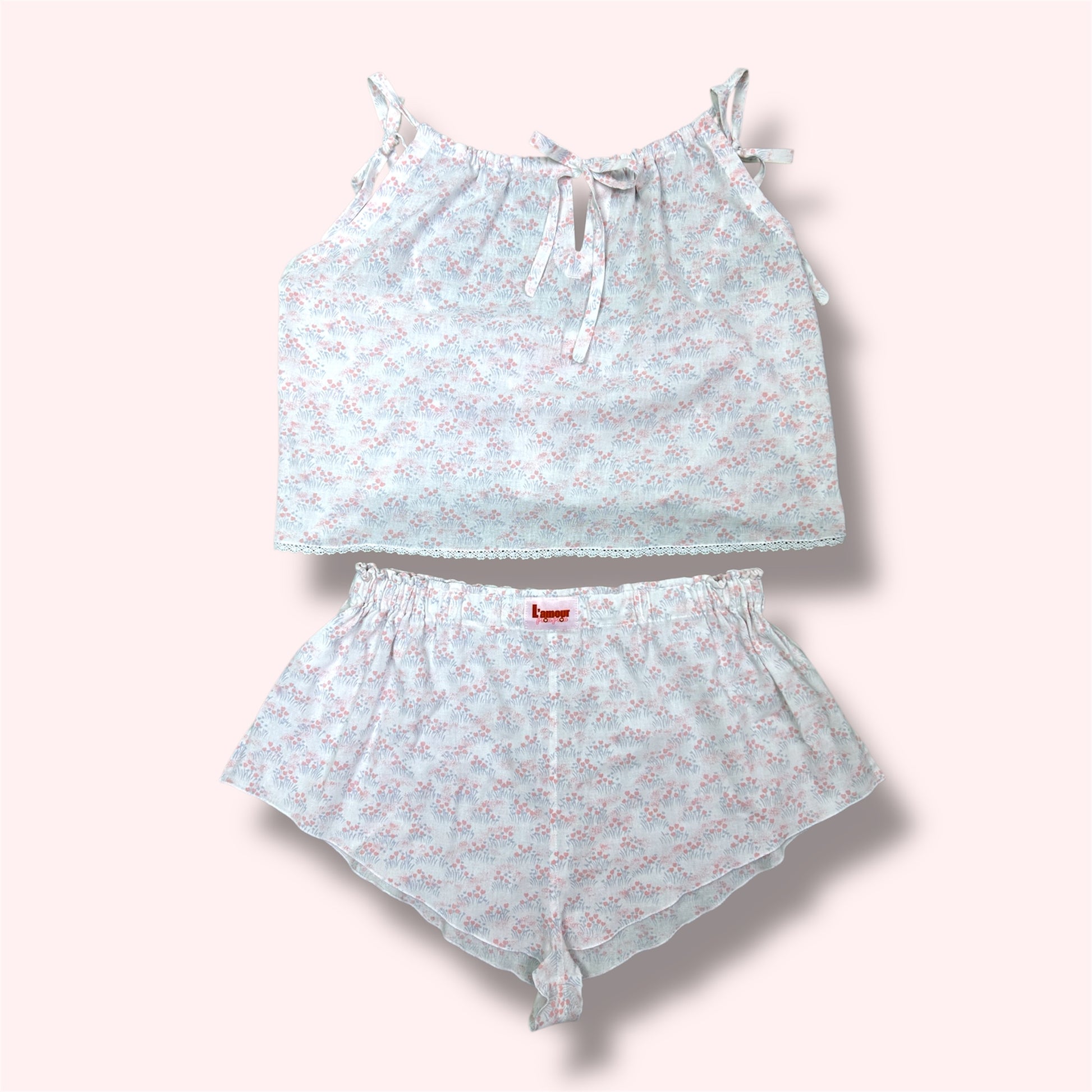 L’ensemble Margaux & Javotte associe deux pièces douces et légères pensées pour le confort et la féminité : le petit haut Margaux, dos nu à fines bretelles réglables, et le short Javotte, à taille élastiquée surmontée d’un petit volant délicat.