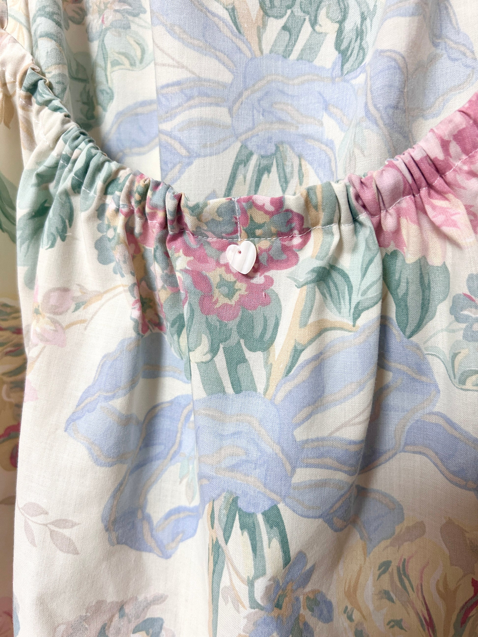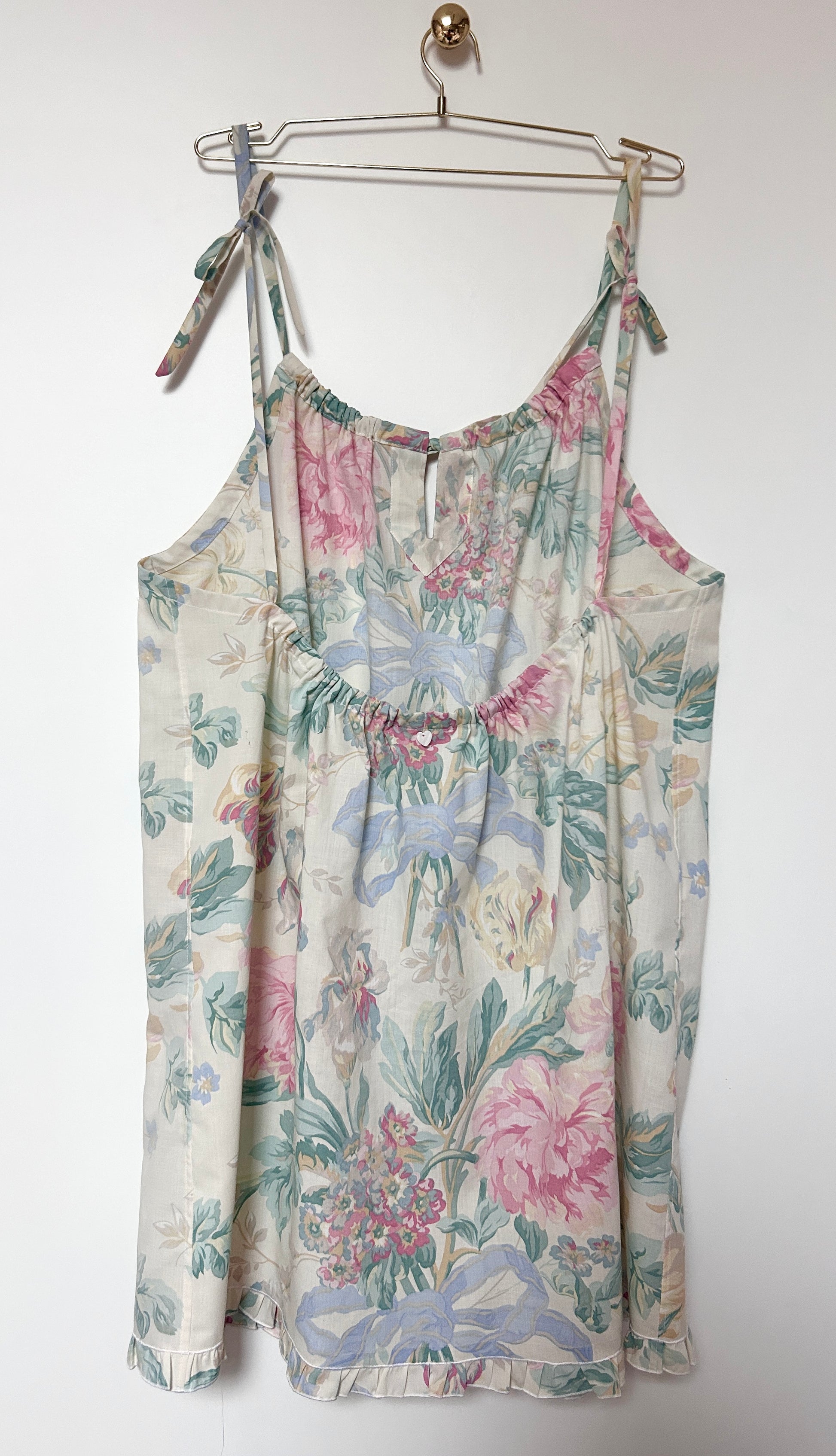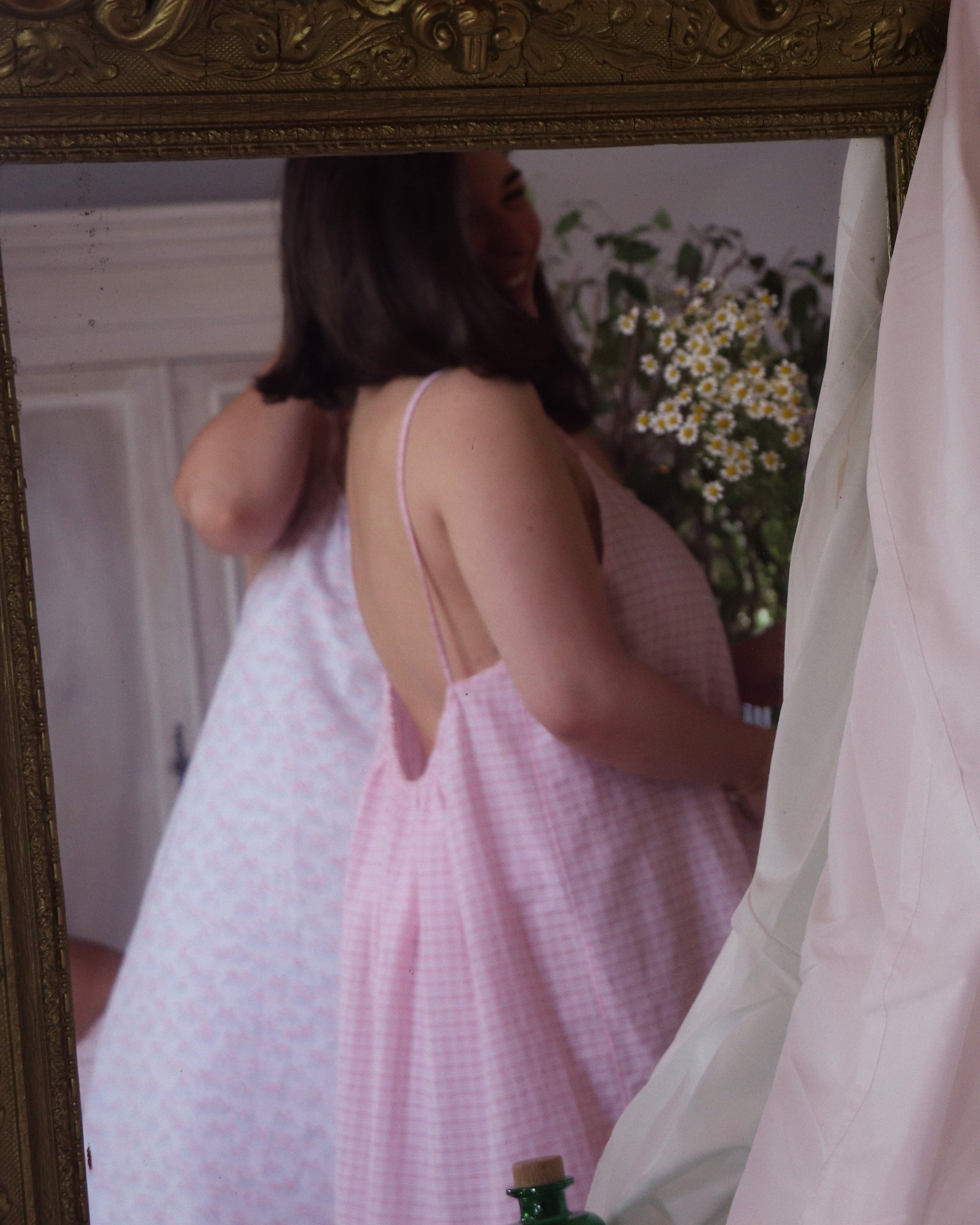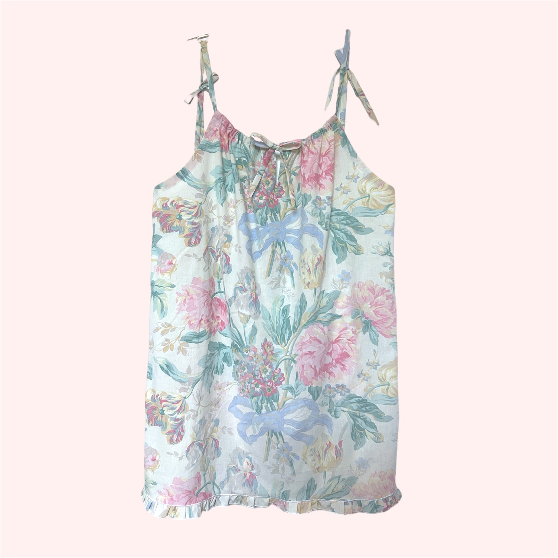 Jeannette est une nuisette légère au charme rétro et poétique, confectionnée avec soin dans un tissu upcyclé aux motifs délicats. Ses fines bretelles à nouer et son joli décolleté goutte d’eau à l’avant apportent une touche féminine tout en subtilité.