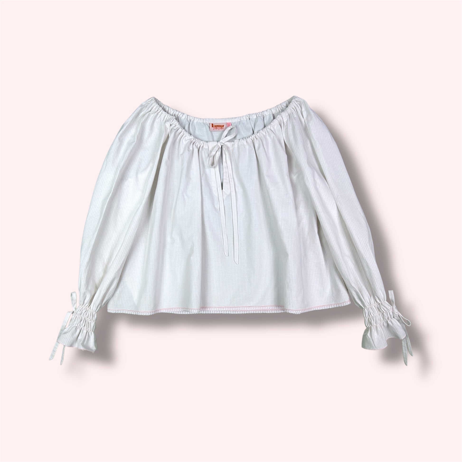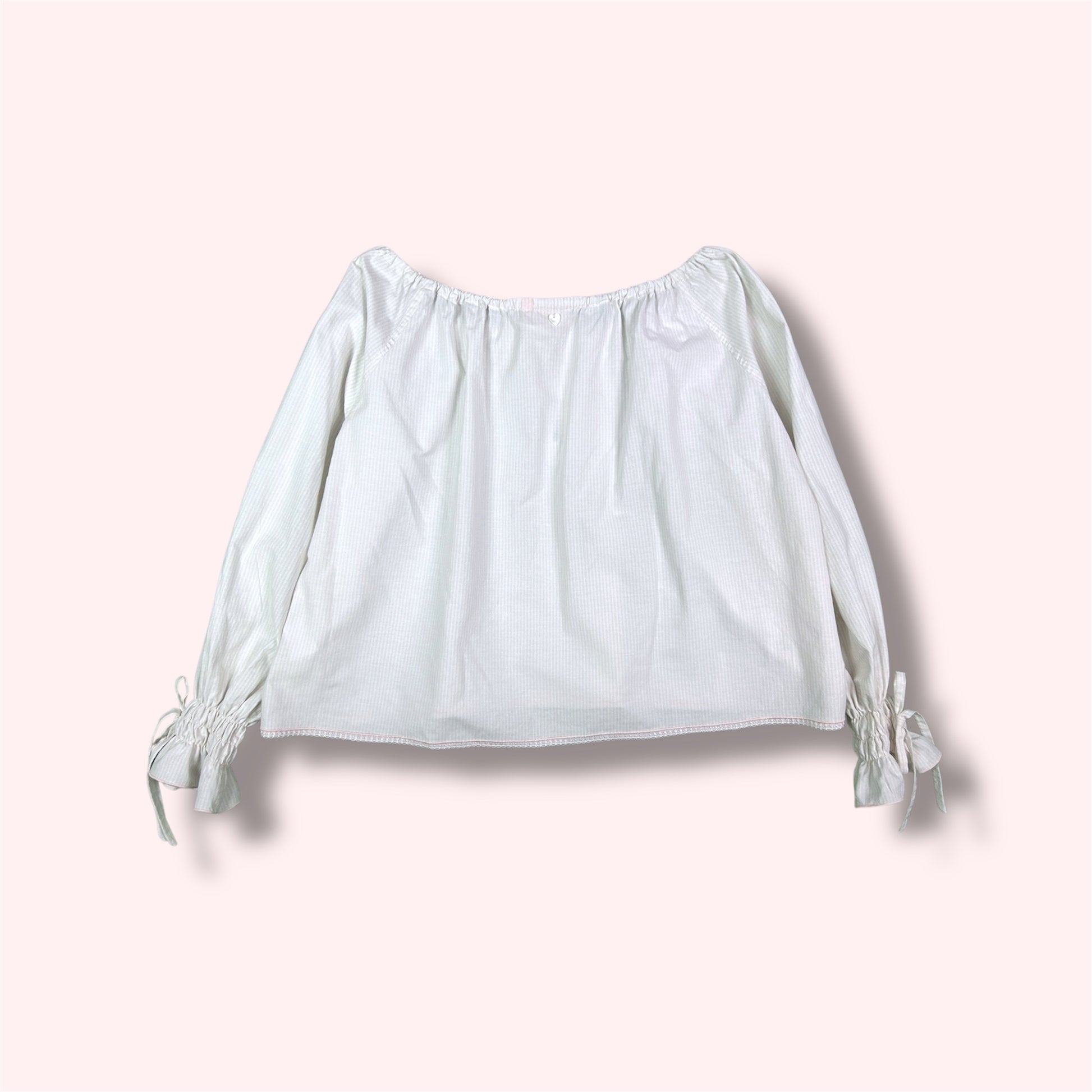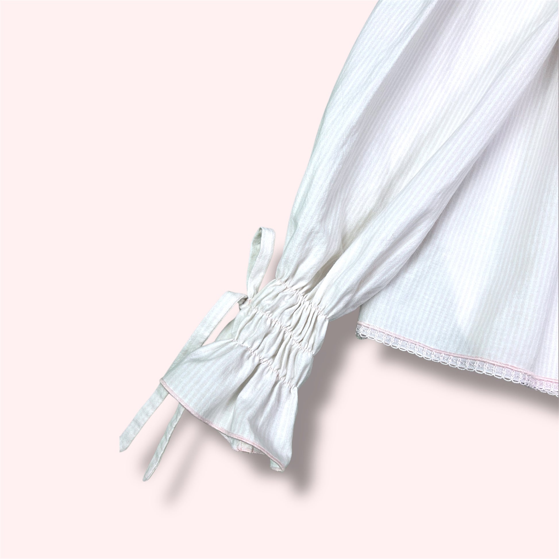 Ses manches longues légèrement bouffantes, resserrées par de fins smocks aux poignets, lui donnent une allure poétique et féminine.